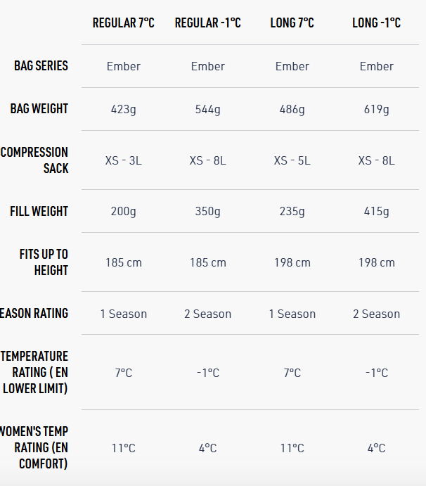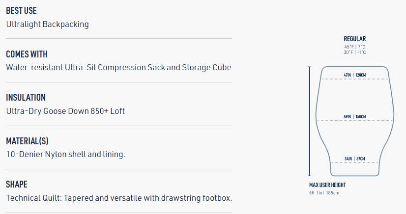 • Construction 7°C: Sewn-through construction. Drawcord in the foot section. Open up to a quilt or cinch tightly to create a ‘foot pocket’. -1°C: Vertical chest baffles, horizontal baffles lower half, box wall baffle construction throughout.