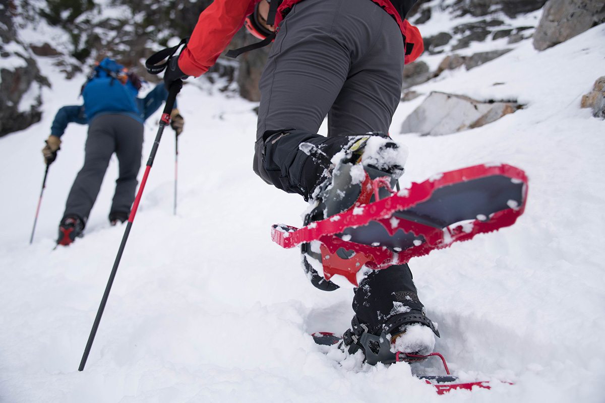 За да облекчите напрежението в прасците и да спестите енергия при изкачвания, коконите могат да се повдигнат под петите ви (професионален съвет: използвайте дръжката, за да ги обърнете нагоре). Използването им също така увеличава сцеплението ви на стръмни склонове. При моделите на MSR, те сес наричат “Televators” и ще ги откриете в моделите от Ascent и Explore сериите.