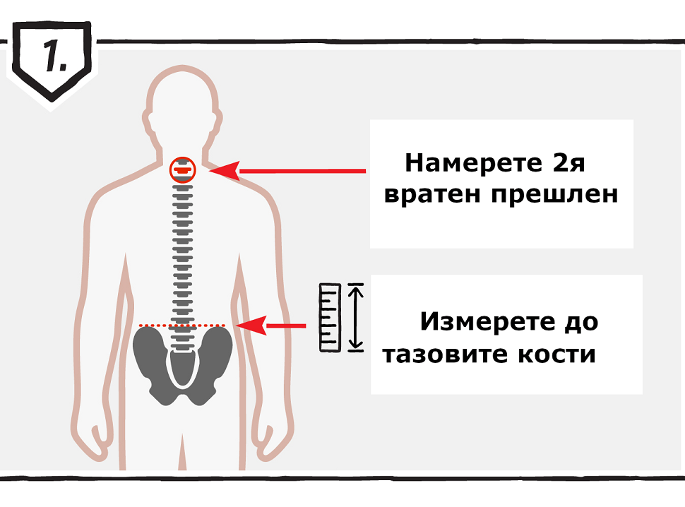 Наклонете главата си напред, за да улесните измерването и намерете най-изпъкналата кост в основата на шията. Това е 2ят вратен прешлен – началната точка за вашата измервателна линия. Отново наклонете главата си нагоре и измерете надолу по гръбначния стълб, докато стигнете до тазовите си кости. Това е точката в центъра на гръбначния ви стълб, която се изравнява с най-високата точка на бедрената ви кост.