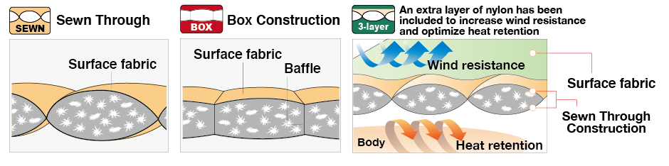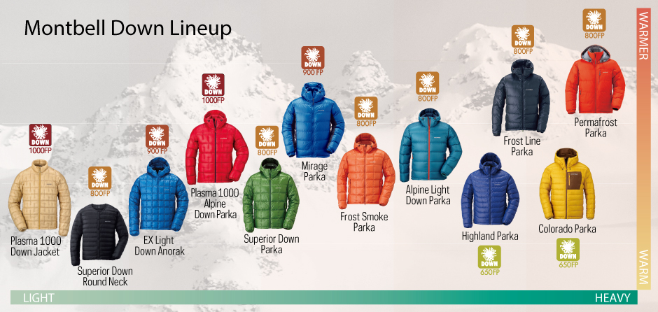 Използваният от Montbell пух е не само висококачествен и ултра лек. За ветровитите заснежени върхове, както и за ежедневните разходки до супермаркета, Montbell произвеждат широка гама пухени облекла. Те създават всяко яке със специфично предназначение и за да отговаря на изискванията, които то поставя, използват различни материали и техники, като уникалното разположение на шевовете, за създаването на възможно най-добрия продукт. Това ви позволява да направите най-добрия избор отговарящ на нуждите ви.