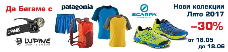 Даваме старт на сезона на бяганията със специално намаление на продуки за бягане от Patagonia, Scarpa и Lupine! Тениски, потници, шорти, раници и якета, създадени за нуждите на бягащите, маратонки за планинско бягане и челници за безкомпромисно осветяване на пътя - всичко това сега може да вземете с -30% намаление! В парка, планината или градските алеи - предизвикваме ви - спрете с извиненията и тичайте! Очакваме ви на адрес Черни връх 90, Стамболийски 46, както и онлайн.
